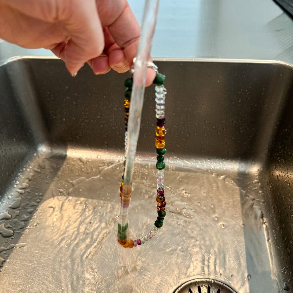 Edelsteinkette kurz unter fliessendes Wasser halten und sanft mit einem Tuch trocken tupfen. Anschliessend die Kette über Nacht, maximal 24 Stunden, auf die Amethysten Druse legen Die Amethysten Druse selbst ist selbstreinigend, nur hin und wieder abstauben, lauwarm abspülen und sanft trocken tupfen.